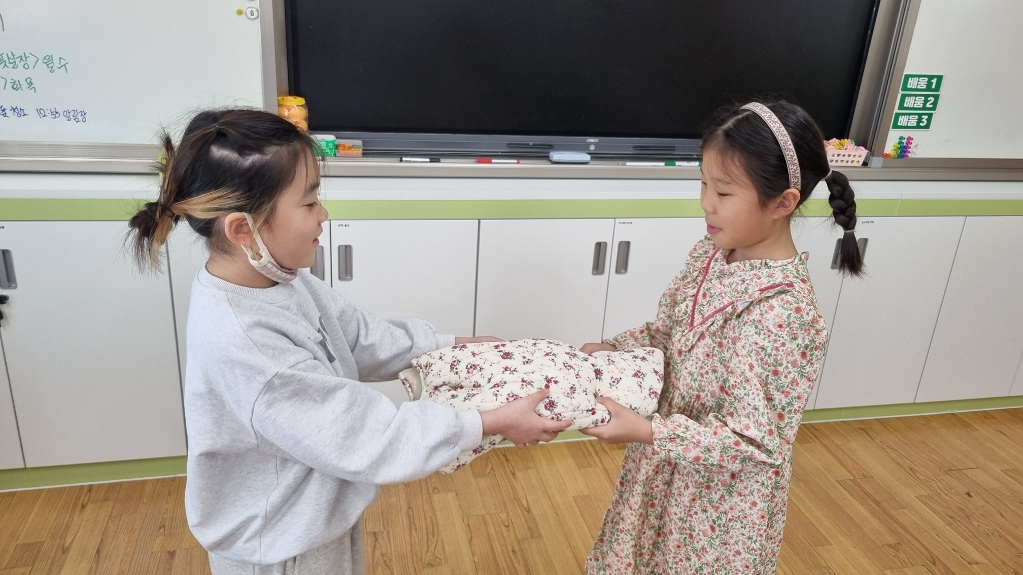 어릴 때 입던 옷이 이제 작아져서 친구 동생에게 '나눔' 했어요!